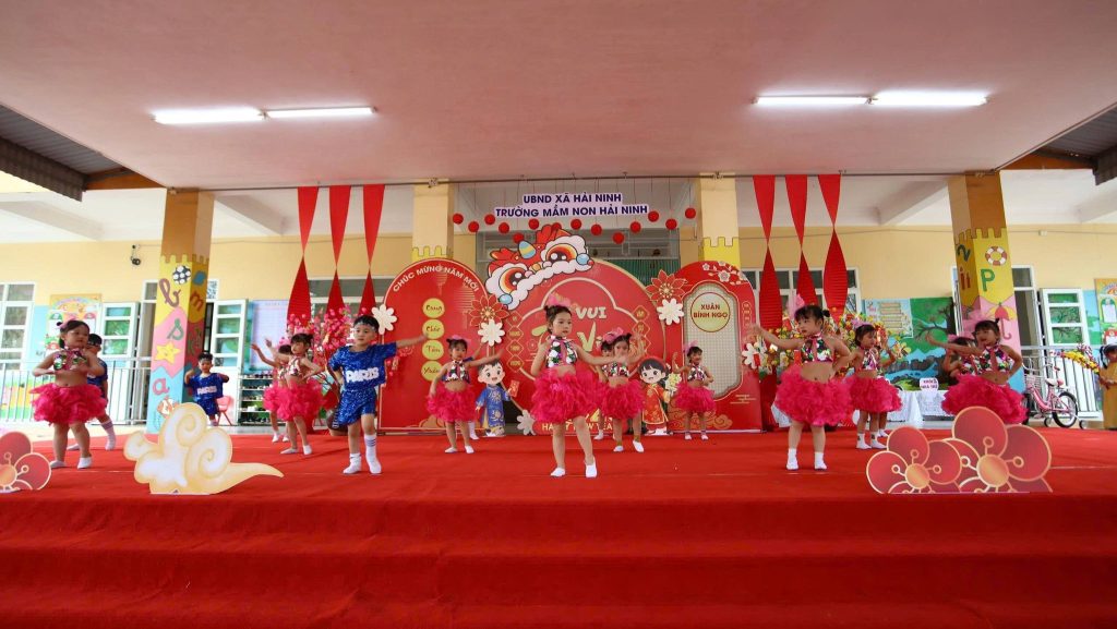 Mở đầu chương trình là những tiết mục văn nghệ mừng xuân rộn ràng, đáng yêu do chính các bé biểu diễn. Từng điệu múa, lời ca hồn nhiên đã mang đến bầu không khí Tết rực rỡ, ngập tràn sắc xuân trên sân trường.