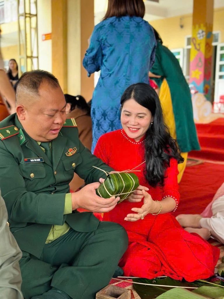 Điểm nhấn của ngày hội chính là các hoạt động trải nghiệm Tết truyền thống: gói bánh chưng, làm xôi ngũ sắc, nhảy sạp mừng xuân. Dưới sự hướng dẫn của cô giáo và sự đồng hành của phụ huynh, các bé được trực tiếp quan sát, tham gia những công đoạn phù hợp với lứa tuổi, cảm nhận hương vị Tết từ những điều gần gũi nhất.